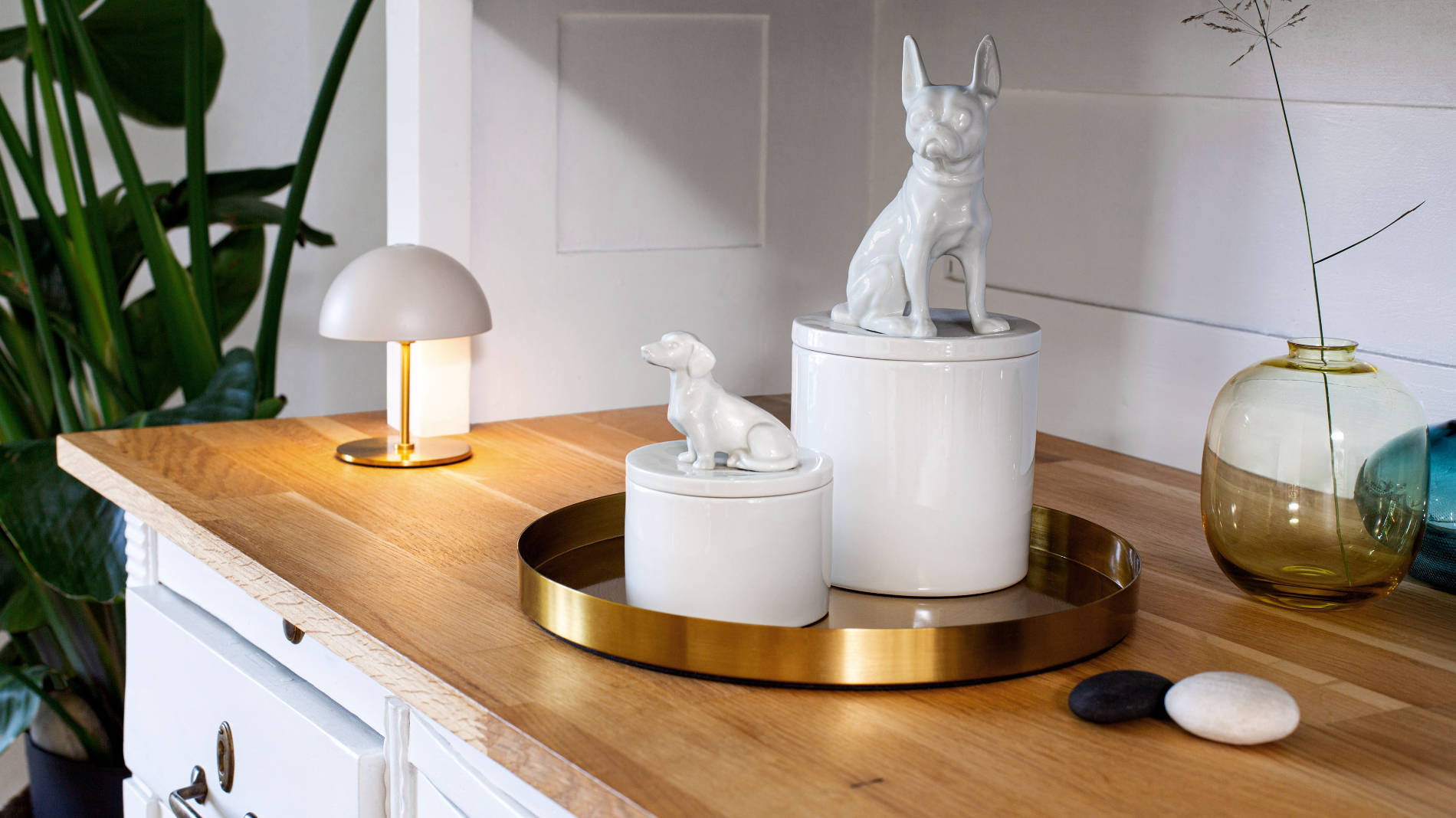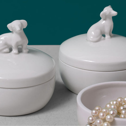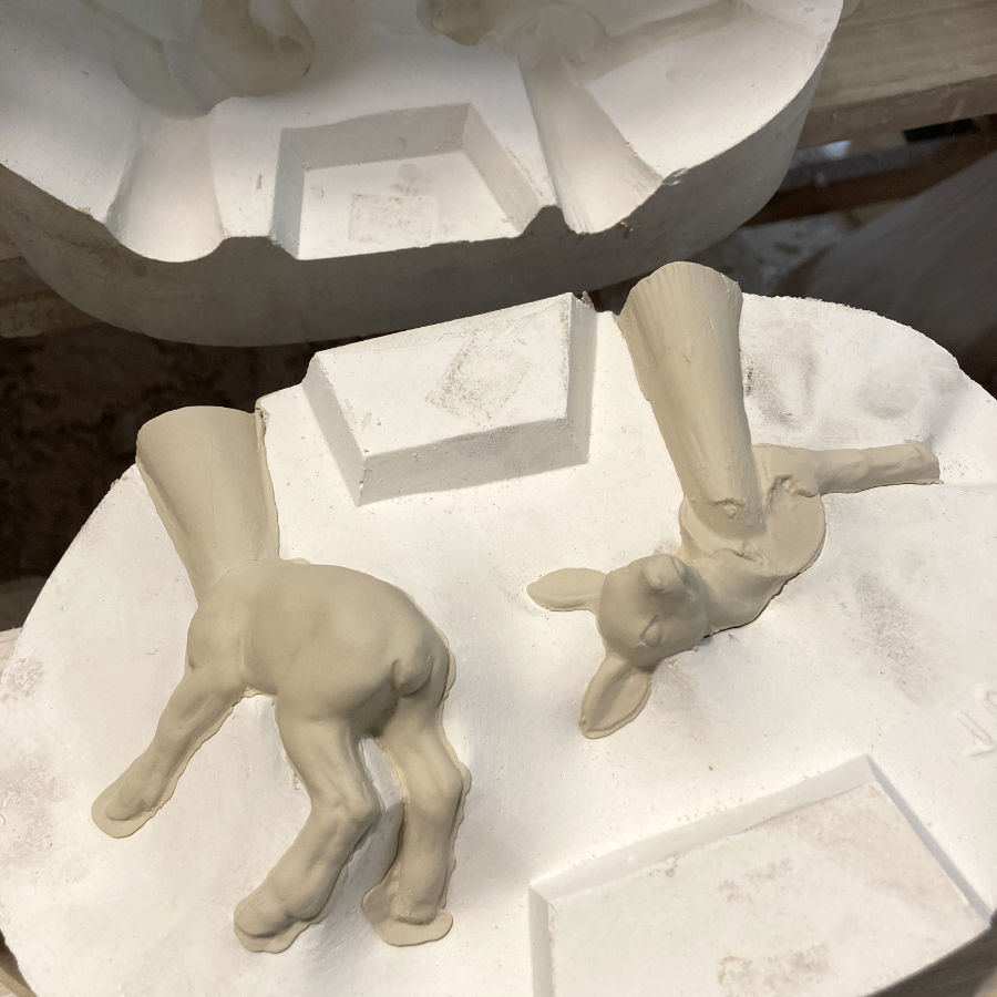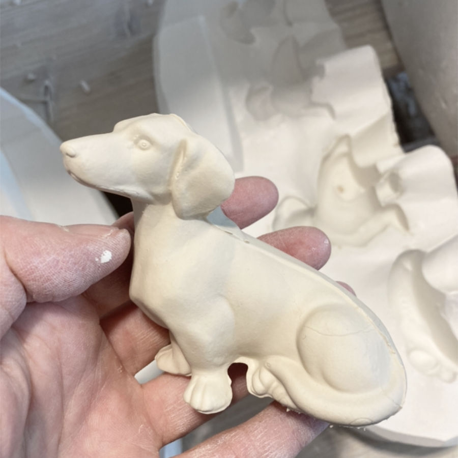 Die Figuren – darunter Dackel, Eichhörnchen, Pinguin, French Bulldog... werden im traditionellen Gießverfahren gefertigt. Jedes der Tiere wird einzeln ausgeformt, aus mehreren Teilen zusammengesetzt und im Ofen fest mit dem jeweiligem Gefäßobjekt verschmolzen.