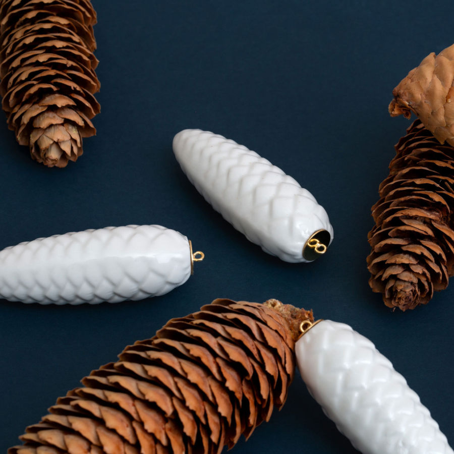 Gefertigt in unserer Berliner Werkstatt, jedes Stück handgeformt und bei 1300 °C gebrannt. Die glatte, glänzende Oberfläche macht den kleinen Zapfen zu einem dezenten, zeitlosen Highlight für deine Weihnachtszeit.