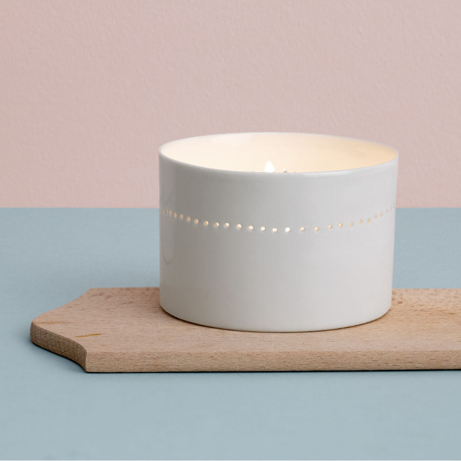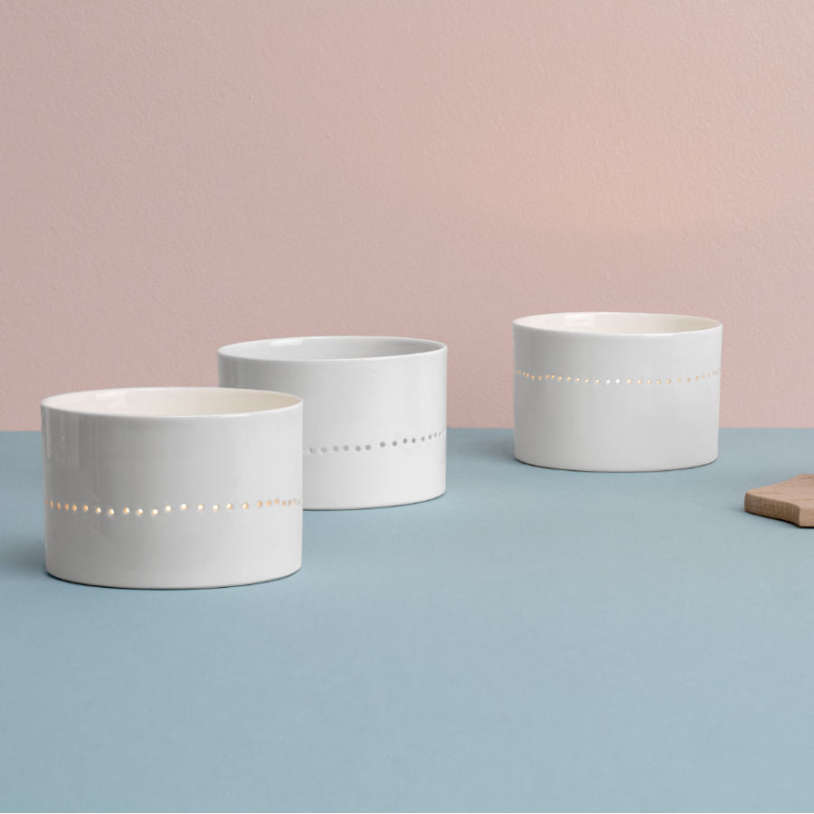 Reduziert, elegant und zeitlos. Unser zylindrisches Windlicht aus Porzellan hat rundum eine feine, perforierte Linie, die jede einzeln von Hand gestochen wird. Sie variiert deshalb bei jedem Stück und macht es zum Unikat.